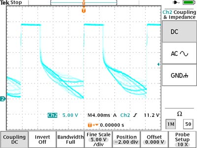 ![]() | Diese Messung ist mir schleierhaft: zu sehen ist der Spannung am Ausgang der Low-Side-Treiber, also die Spannung, die an den LED's nebst Konstantstromquelle anliegt. Ich würde hier ein sauberes PWM-Signal erwarten, stattdessen fällt die Spannung von 26V zunächst auf ca. 13V ab, um dann nur noch langsam abzufallen. Ich vermute, dass nach Abfallen unter die Schwellspannung der LED's der Stromfluss schlagartig abnimmt und sich so die Restspannung halten kann. |